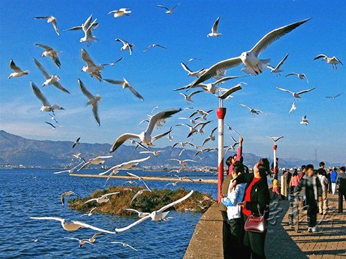 滇池位于昆明市西南,是云南省面积最大的高原湖泊,素有高原明珠之称。又名昆明湖。滇池,位于西山脚下,距市区约5公里,北端紧邻大观公园,云南民族村与西山公园隔水相望。进入滇池,迎面就是阵阵凉爽的微风,瞩目远眺,和蓝天连为一体,右侧群山环抱,云朵就在山顶飘荡,湖水、绿色植被、蓝天、白云连为水天一色,确是一道美景!滇池东南北三面,有盘龙江等20余条河流汇入,湖水由西面海口流出,经普渡河而入金沙江。形似弦月,湖面宽阔,人称五百里滇池,是中国第六大内陆淡水湖。在滇池附近,还有观音山风景区、白鱼口空谷园、海埂湖滨浴场以及大观公园等景点。在这里,您可以尽享大自然所给予人类的慷慨馈赠。