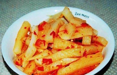 在凤凰饭馆吃饭前,每桌都会上一盘免费的酸萝卜开胃,口味酸辣爽脆,蘸着辣椒汁更好吃,一般都可免费续吃。