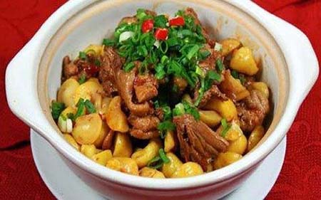 板栗是凤凰的一大土特产,尤以籽粒饱满,果实肥厚颗大的乌油板栗为最佳,板栗炖鸡是土乡苗寨稀有的特殊菜谱。吃板栗炖鸡主要是吃它的营养。吃时候要注意,鸡汤是很烫人的,不要随便趁热吃,先要凉一下再吃。吃完饭后,再喝一两碗汤。汤要慢慢地品,就能感觉到鸡汤的味道,先是甜再是香。