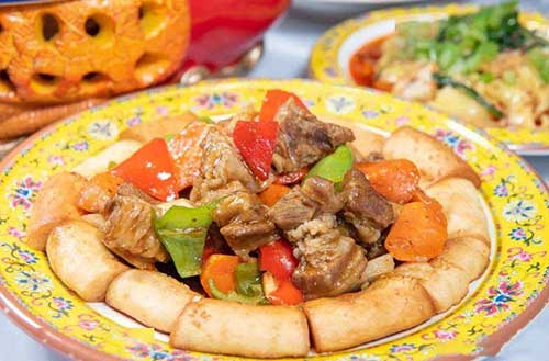 在新疆馕绝对是必吃的美食之一,但是要说和馕相关的菜品,老于推荐大家试试馕包肉!馕包肉的维吾尔语音译为“塔瓦喀瓦甫”,即锅烧肉的意思。它是先把羊排肉煎炸至熟,在于其他酌料炖至软烂,然后铺在囊上,可以说这是一道有肉有菜有面的一道菜品!